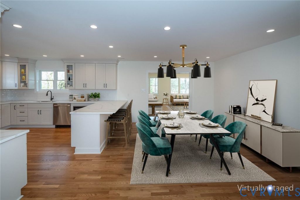 Waterfront property. Wake up every day to peaceful water views in this beautifully renovated brick ranch offering three bedrooms, three full baths, and a seamless blend of modern comfort and timeless charm. This home features an open floor plan, refinished hardwood floors, and a stunning new kitchen with quartz countertops, stainless steel appliances, and elegant cabinetry. The primary suite includes walk-in closet and a beautifully tiled walk-in shower. Enjoy the beauty of Falling Creek Reservoir from the bright and spacious sunroom, perfect for relaxing or entertaining. The lower level adds incredible versatility with a well-lit office, plus a large unfinished flex space ideal for a gym, media room, or recreation area. Additional upgrades include a newer roof and new two-zone HVAC for efficient comfort. A rare opportunity to own a fully updated waterfront home with exceptional indoor and outdoor living spaces. All interior photos are virtually staged, and house front is virtually landscaped.