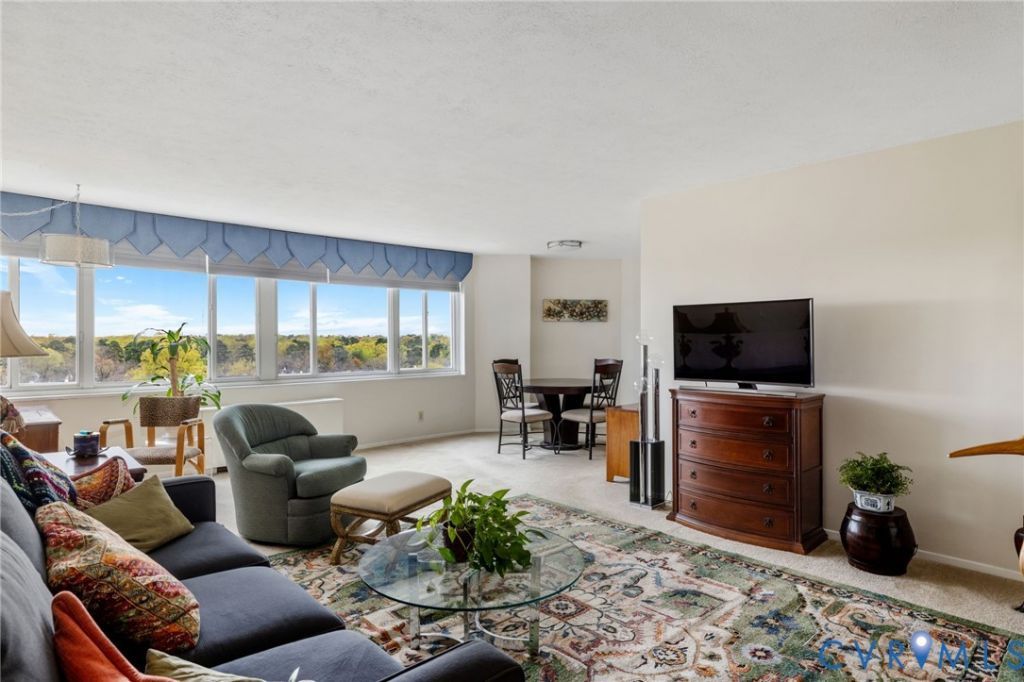 AMAZING PENTHOUSE VIEWS from the top floor in this cozy, renovated one bedroom/one bath condo in the historic 5100 Monument building. The expansive, carpeted living room and dining areas are bathed in natural light from the wall of windows with new decorative shades. Completely renovated kitchen with gorgeous floor, stainless steel appliances, granite counter tops, and an enormous pantry with decorative barn door. The primary bedroom is large with a ceiling fan, double closet, new shades and some more INCREDIBLE VIEWS! Terrific storage throughout. The condo building is conveniently located near St. Mary's Hospital and next to the Willow Lawn shopping center, within walking distance of many restaurants and retail, including Kroger. All utilities are included in the low monthly HOA dues, except phone/cable/internet. Each floor provides a laundry, trash chute and mail chute. There is a 24-hour concierge desk, key-fob entry, lovely lobby, library, work-out room, common area, salon, rooftop deck, and the recently renovated POOL area with new decking, patio, and landscaping. Restricted parking available for up to 2 cars in the adjacent parking area. Enjoy the spectacular sunrises from your home in the warm and welcoming community of 5100 Monument.